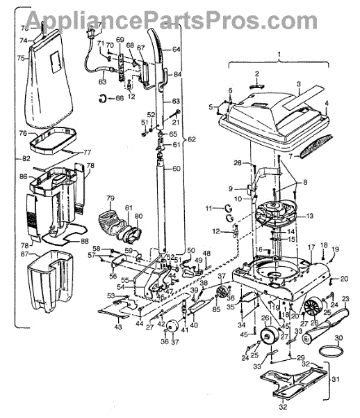 Parts for Hoover C1525---: 01 - Agitator, Handle, Mainbody, Outerbag Parts