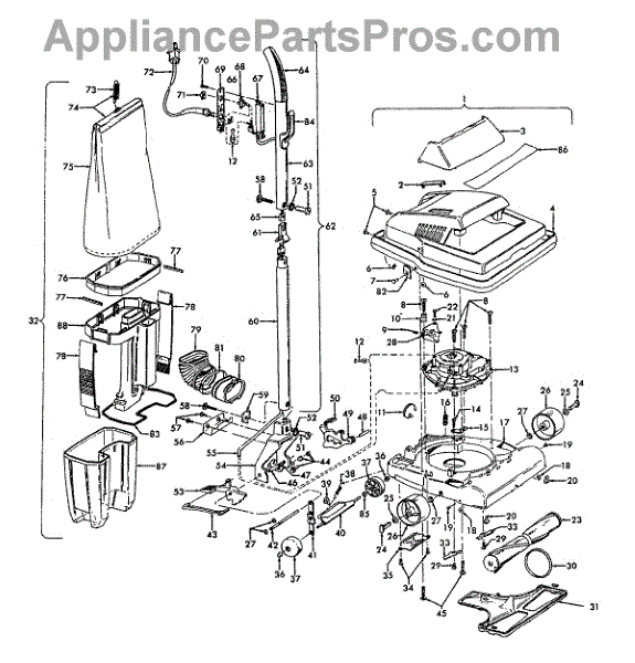 Parts for Hoover C1633012: 01 - Agitator, Handle, Mainbody, Dirtcup Parts