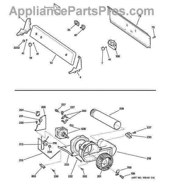 The Blower Wheel is an OEM replacement part for GE dryers. It has a role in the air circulation within the dryer, aiding in the even and efficient drying of clothes. The blower wheel, connected to the motor, helps in expelling the moist air out of the dryer through the exhaust vent during the drying cycle. Causes of a malfunctioning blower wheel are typically wear and tear from regular use, the accumulation of lint or debris, or damage to the wheel’s fins or central hub, which can impact its rotation and air circulation capability. Symptoms of a bad Blower Wheel include: