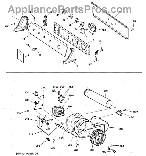The Blower Wheel is an OEM replacement part for GE dryers. It has a role in the air circulation within the dryer, aiding in the even and efficient drying of clothes. The blower wheel, connected to the motor, helps in expelling the moist air out of the dryer through the exhaust vent during the drying cycle. Causes of a malfunctioning blower wheel are typically wear and tear from regular use, the accumulation of lint or debris, or damage to the wheel’s fins or central hub, which can impact its rotation and air circulation capability. Symptoms of a bad Blower Wheel include: