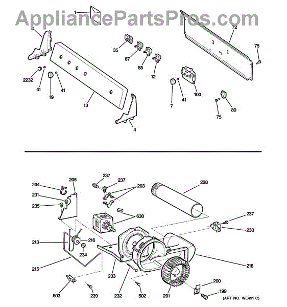 The Blower Wheel is an OEM replacement part for GE dryers. It has a role in the air circulation within the dryer, aiding in the even and efficient drying of clothes. The blower wheel, connected to the motor, helps in expelling the moist air out of the dryer through the exhaust vent during the drying cycle. Causes of a malfunctioning blower wheel are typically wear and tear from regular use, the accumulation of lint or debris, or damage to the wheel’s fins or central hub, which can impact its rotation and air circulation capability. Symptoms of a bad Blower Wheel include: