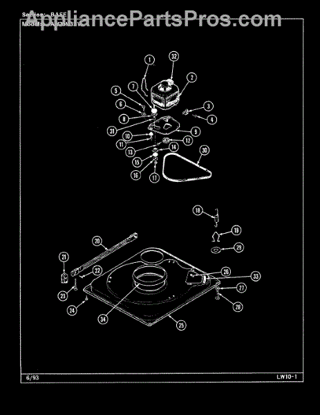 • This part mounts between the motor and chassis; access typically requires tilting or removing the washer cabinet or accessing the underside.