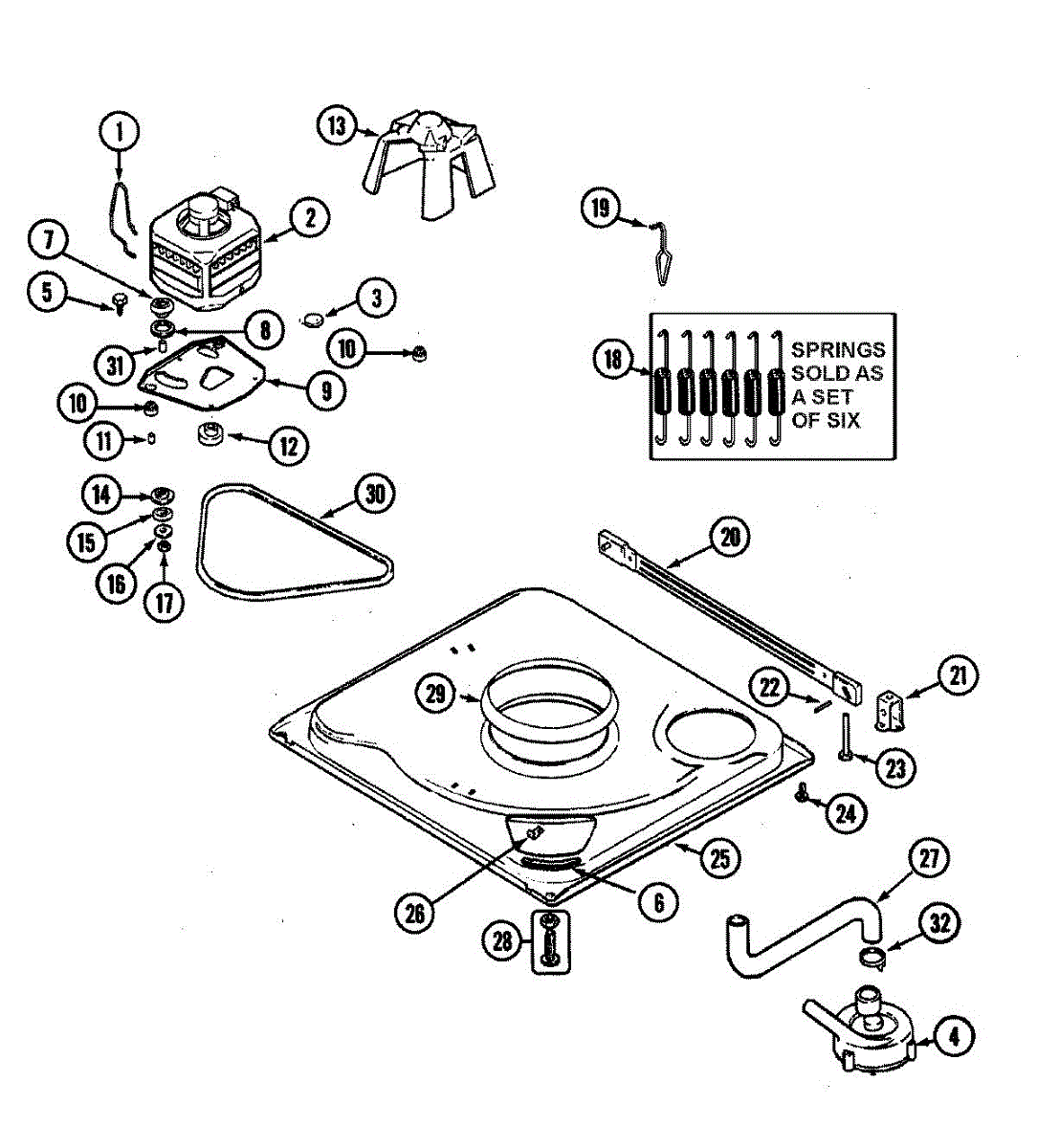 Kit of six suspension springs that support and stabilize the washer tub. Replace when springs lose tension, causing tub to tilt or sag improperly.