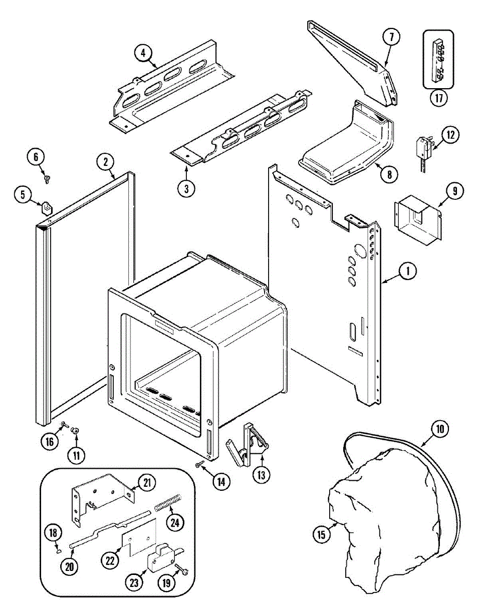 Metal housing that holds and positions oven bake/broil burners. Replace if cracked, rusted, warped, or damaged to restore proper burner support.