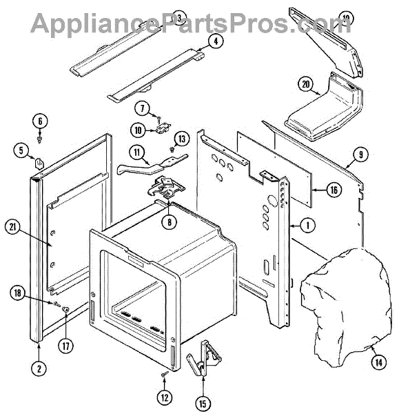 This burner box is the oven's metal housing that holds and positions the bake/broil burners and channels gas flames for proper heating. Replacing a damaged box restores safe flame direction and consistent oven operation. What it does