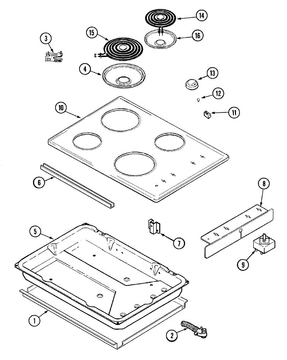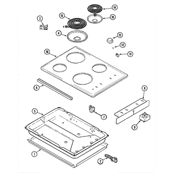 Shallow metal drip pan installs below burner elements to catch grease and spills. Replace when discolored, rusted, warped, or damaged for a clean cooktop.