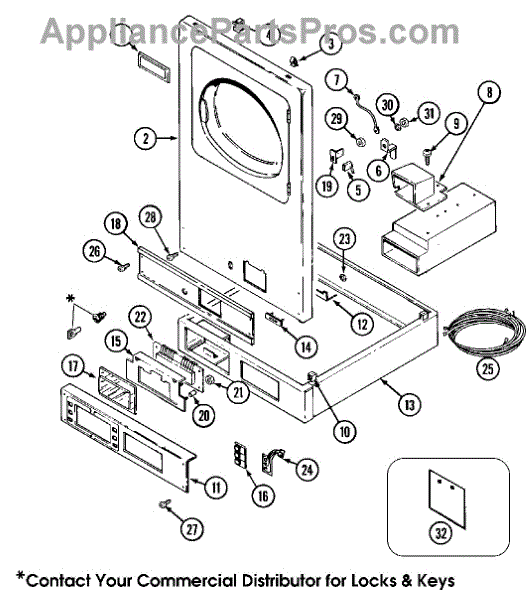 This lock assembly secures the appliance access panel and restores a proper, stable latching action for safe operation. It replaces a worn or broken access lock so the panel stays closed when the appliance is in use. What it does: