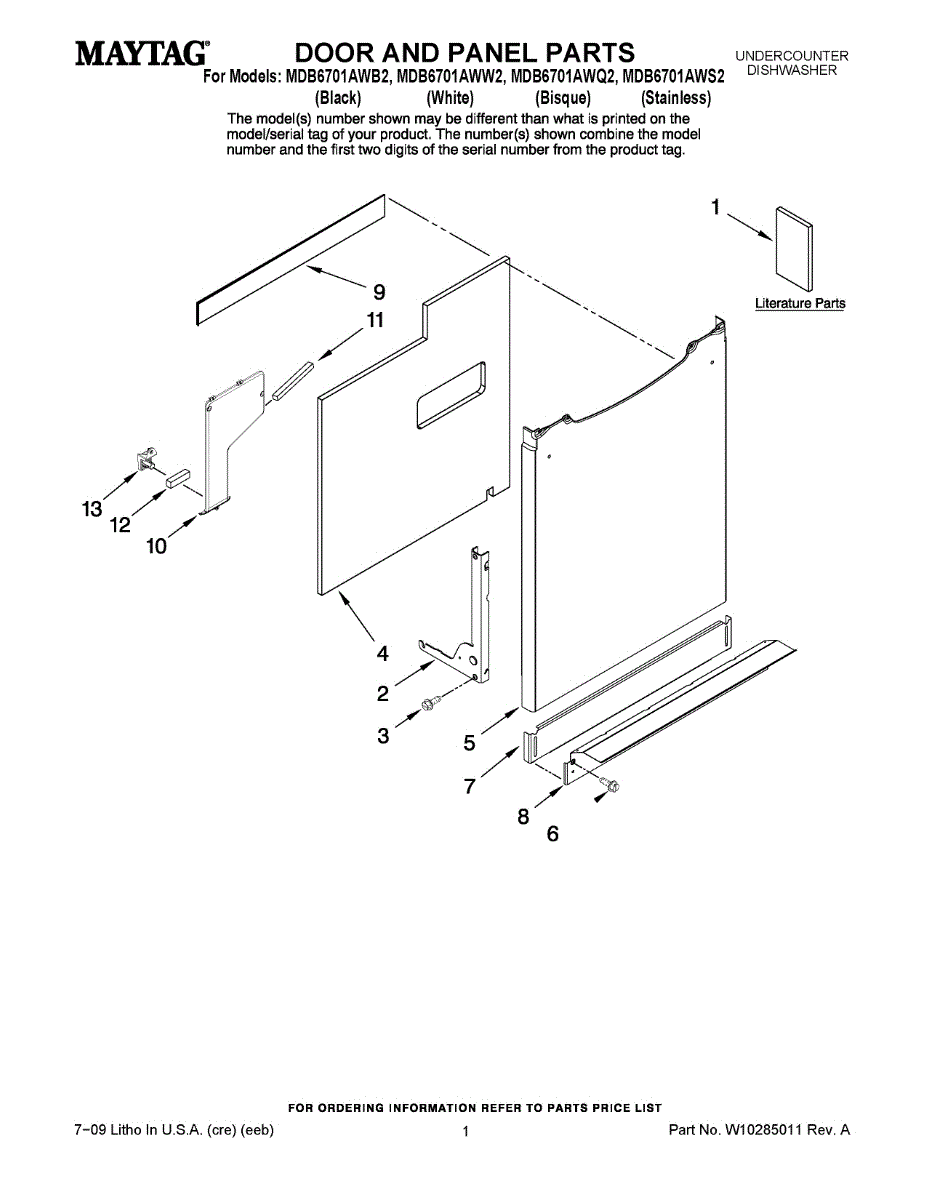 Inner door panel for dishwashers. Covers the interior door frame and provides structural support. Replace if cracked, warped, or damaged from wear.