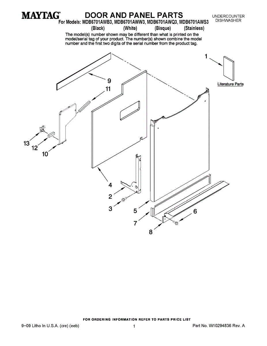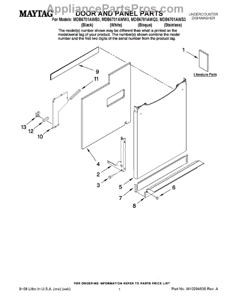 Inner door panel for dishwashers. Covers the interior door frame and provides structural support. Replace if cracked, warped, or damaged from wear.