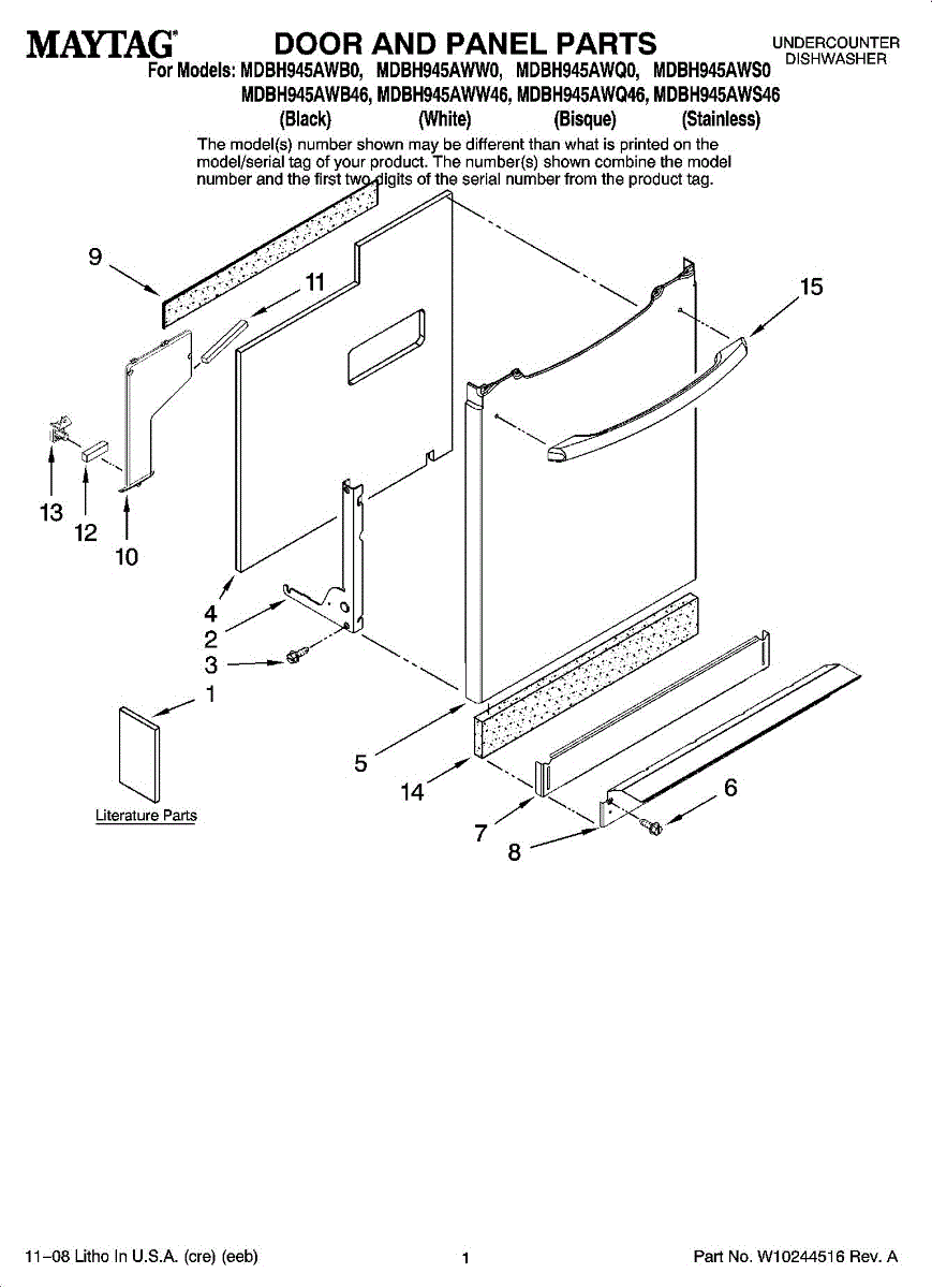Inner door panel for dishwashers. Covers the interior door frame and provides structural support. Replace if cracked, warped, or damaged from wear.