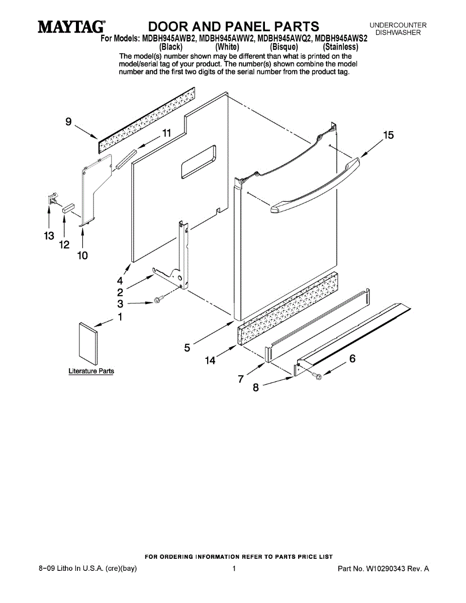 Inner door panel for dishwashers. Covers the interior door frame and provides structural support. Replace if cracked, warped, or damaged from wear.