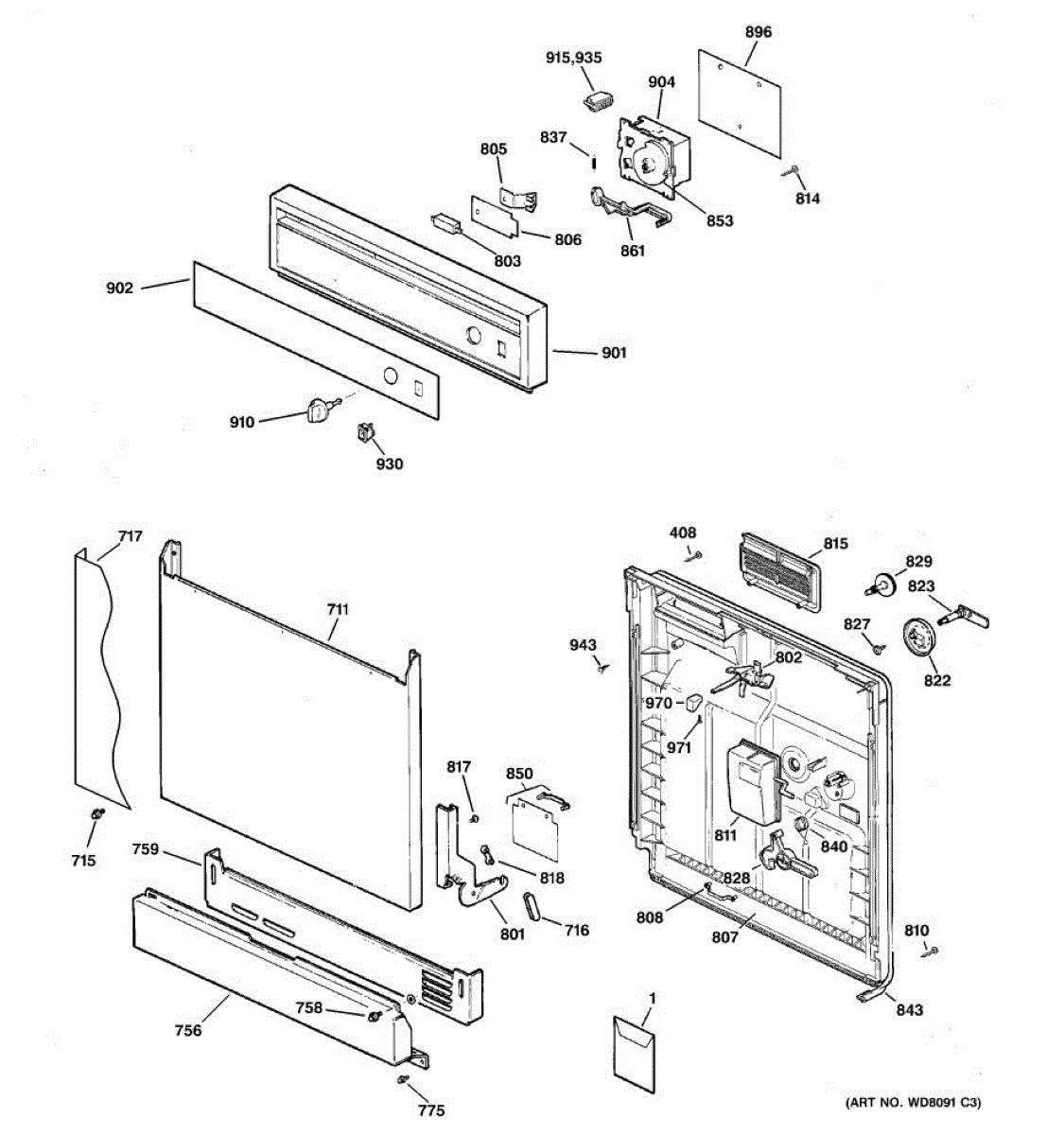 This lever connects to the dishwasher detergent dispenser mechanism and actuates the cup lid. A worn or damaged lever can prevent the dispenser from opening at the right time, reducing wash performance.