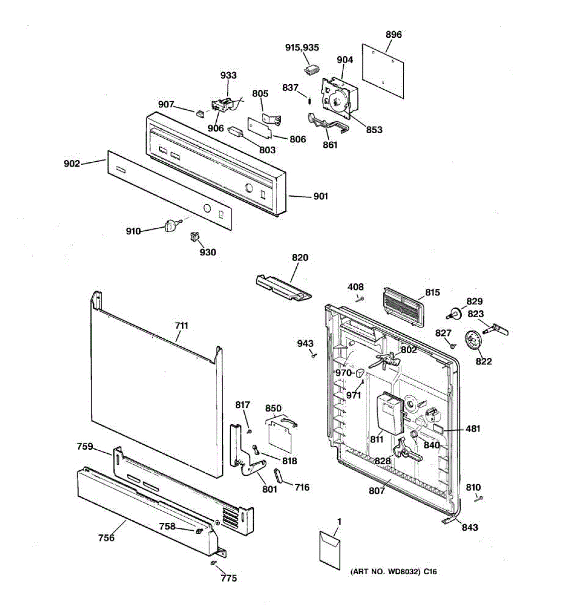 This lever connects to the dishwasher detergent dispenser mechanism and actuates the cup lid. A worn or damaged lever can prevent the dispenser from opening at the right time, reducing wash performance.