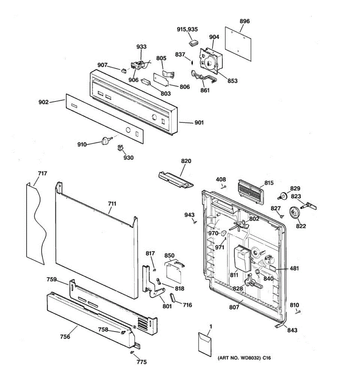 This lever connects to the dishwasher detergent dispenser mechanism and actuates the cup lid. A worn or damaged lever can prevent the dispenser from opening at the right time, reducing wash performance.