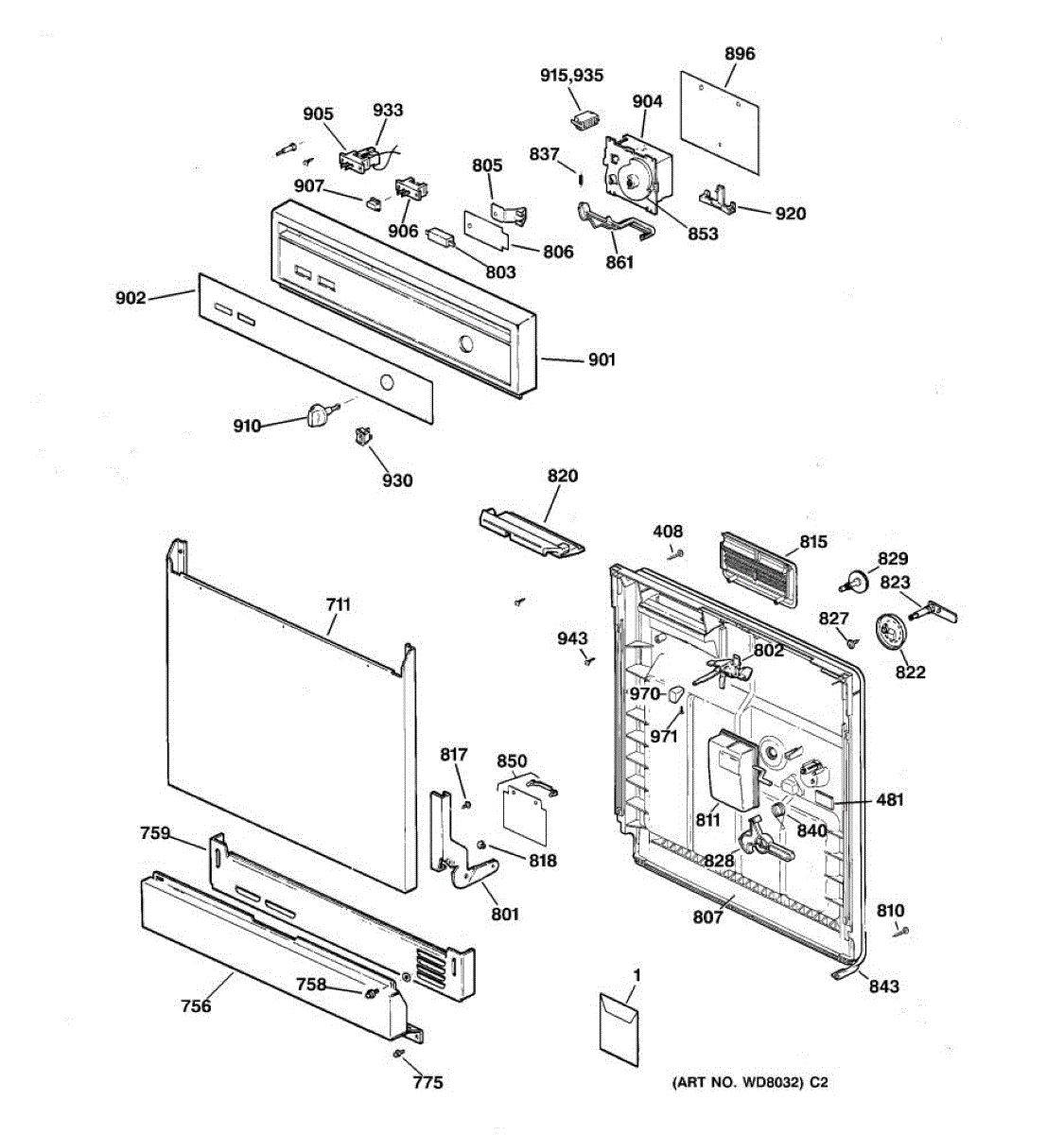 This lever connects to the dishwasher detergent dispenser mechanism and actuates the cup lid. A worn or damaged lever can prevent the dispenser from opening at the right time, reducing wash performance.