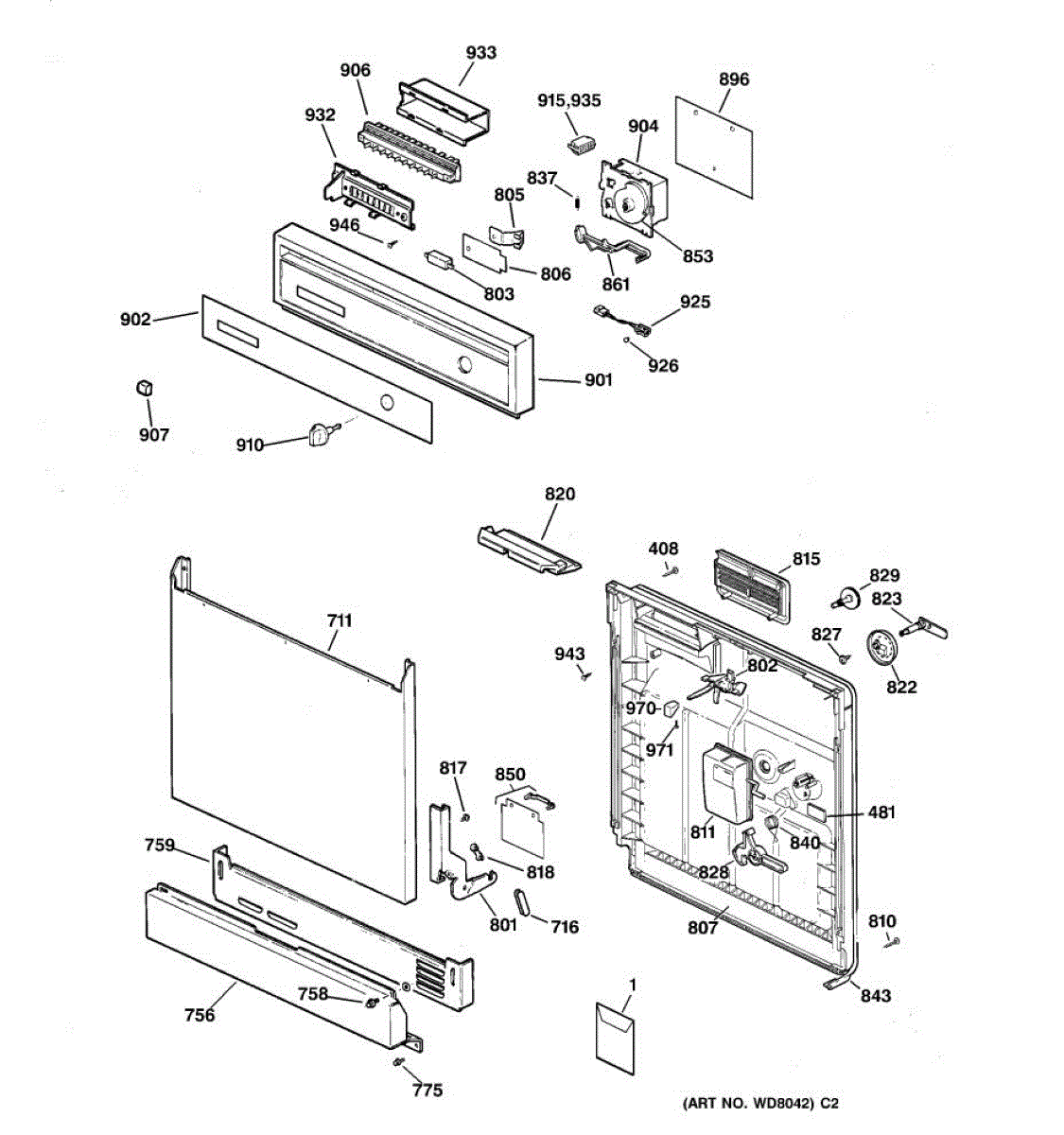 This lever connects to the dishwasher detergent dispenser mechanism and actuates the cup lid. A worn or damaged lever can prevent the dispenser from opening at the right time, reducing wash performance.