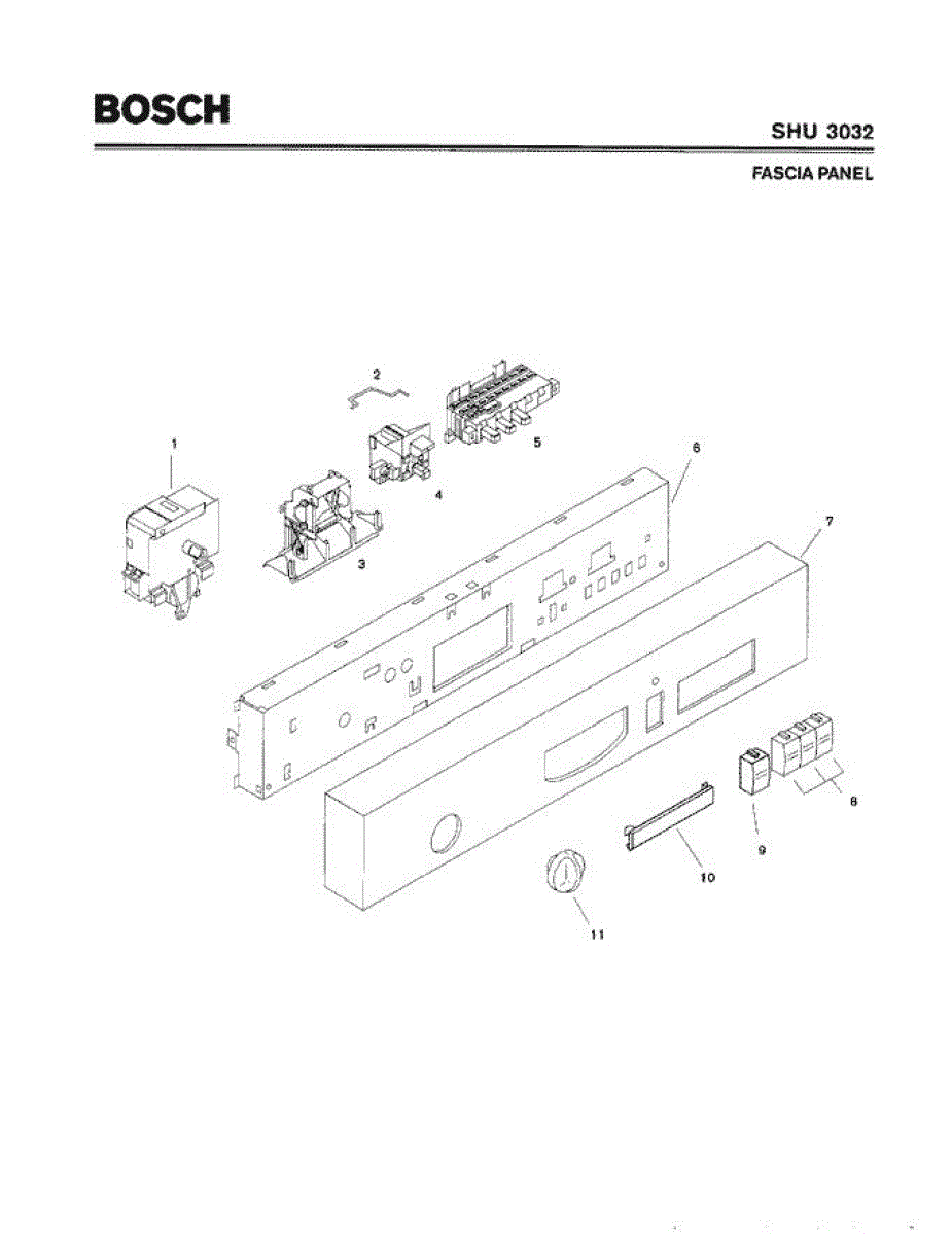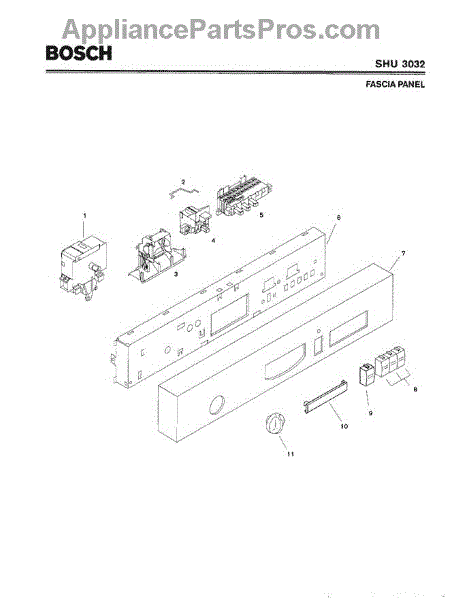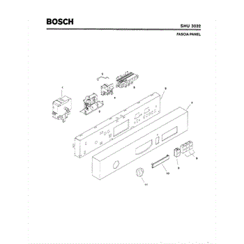 White plastic fascia panel cover for Bosch dishwasher control panel. Replace this decorative front cover if cracked, discolored, or missing.