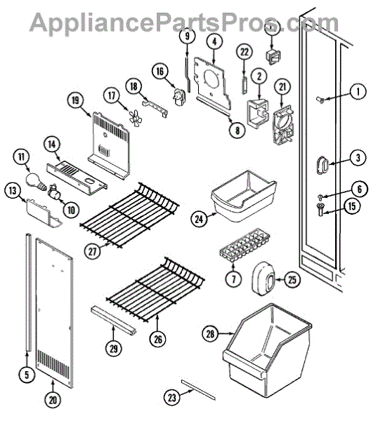 This refrigerator ice bucket stores ice made by the icemaker and positions it for dispensing. Replacing a cracked or warped bin restores smooth ice flow and helps prevent jams, spills, and mess inside the freezer.