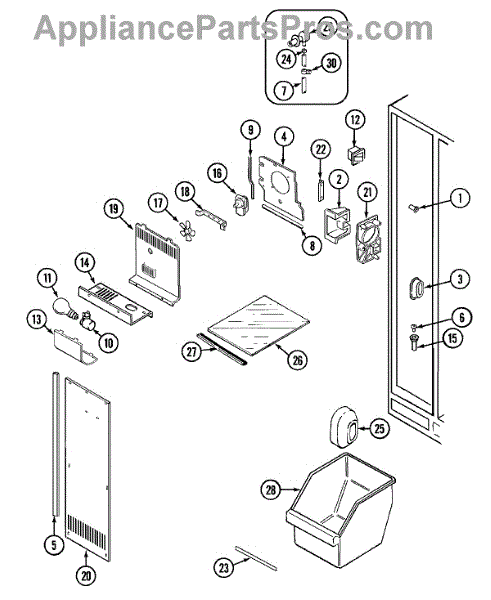 This refrigerator ice bucket stores ice made by the icemaker and positions it for dispensing. Replacing a cracked or warped bin restores smooth ice flow and helps prevent jams, spills, and mess inside the freezer.