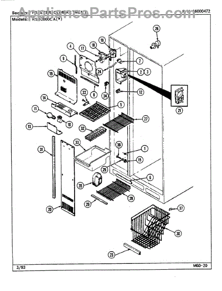 This refrigerator ice bucket stores ice made by the icemaker and positions it for dispensing. Replacing a cracked or warped bin restores smooth ice flow and helps prevent jams, spills, and mess inside the freezer.