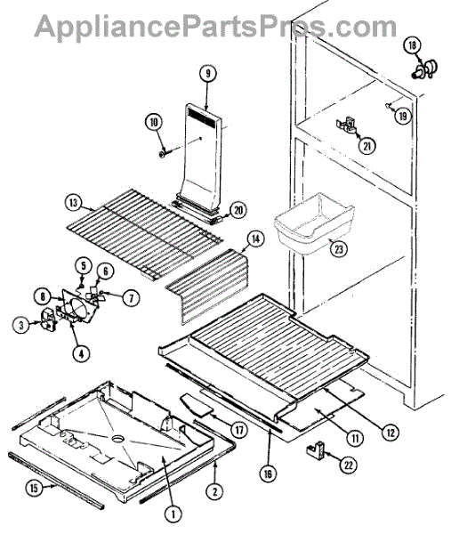 This refrigerator ice bucket stores ice made by the icemaker and positions it for dispensing. Replacing a cracked or warped bin restores smooth ice flow and helps prevent jams, spills, and mess inside the freezer.