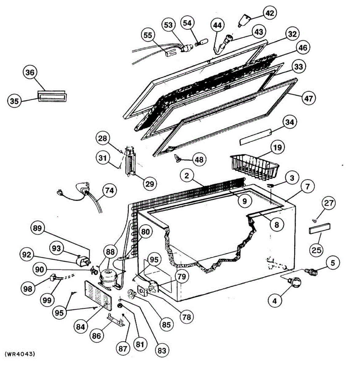 Mounting screw for chest and freestanding freezers. Secures internal components and panels. Replace if stripped, missing, or damaged during repairs.