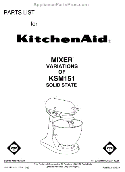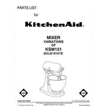Parts for Kitchenaid KSM151: 01 - Front Cover Parts