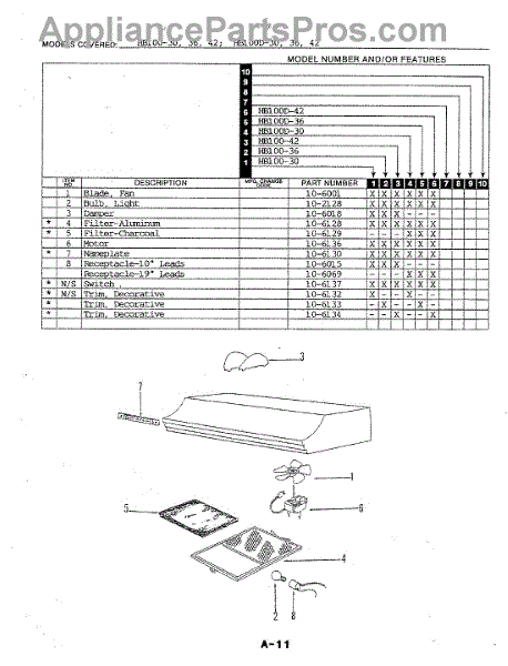 Parts for Magic Chef HB100-36: 01 - Hood Parts