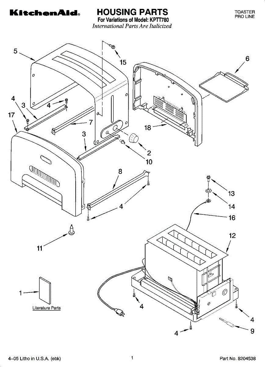 Parts for Kitchenaid KPTT780: 01 - Housing Parts