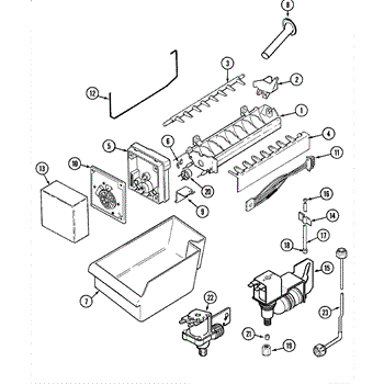 This icemaker fill cup and bearing assembly directs water from the inlet tube into the ice mold and provides the pivot point for the shutoff arm. Replacing a cracked or missing cup helps stop leaks, misdirected fills, and inconsistent ice production.