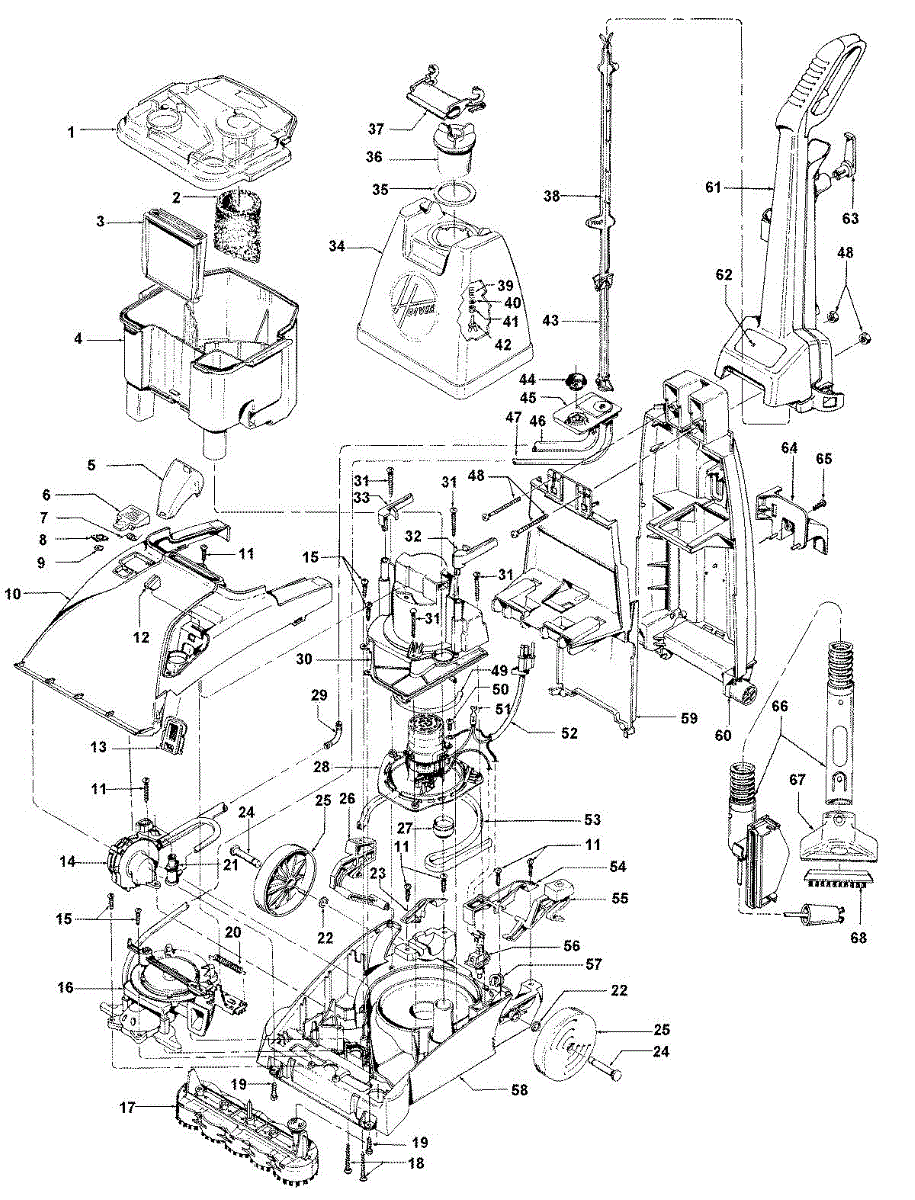 Parts for Hoover F5857906: 01 - Mainhousing, Motor, Hose, Handle Parts