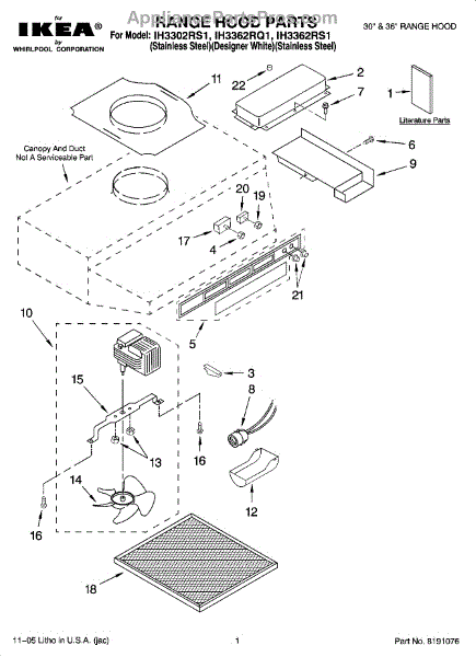 Parts for Whirlpool IH3362RS1: 01 - Range Hood Parts