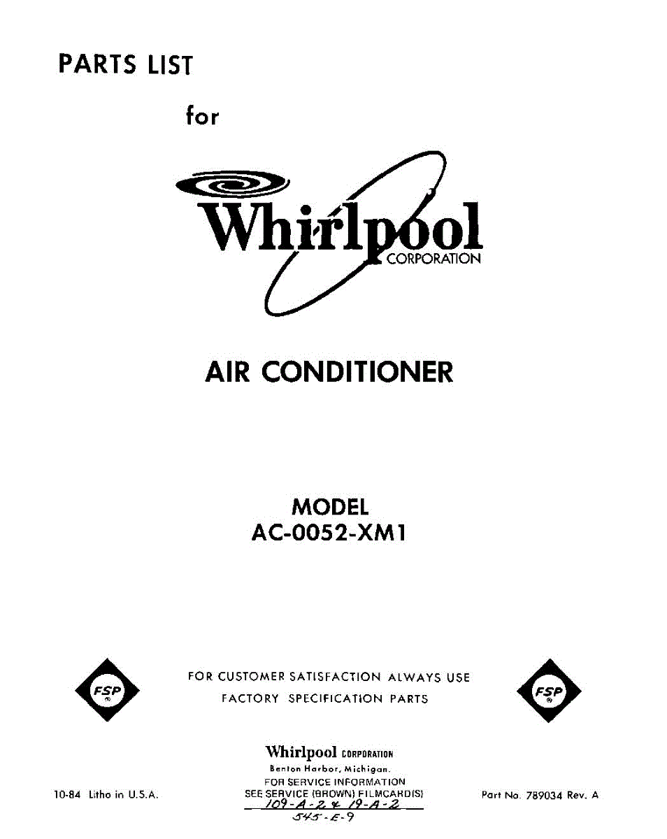 Parts for Whirlpool AC0052XM1: 01 - Section Parts