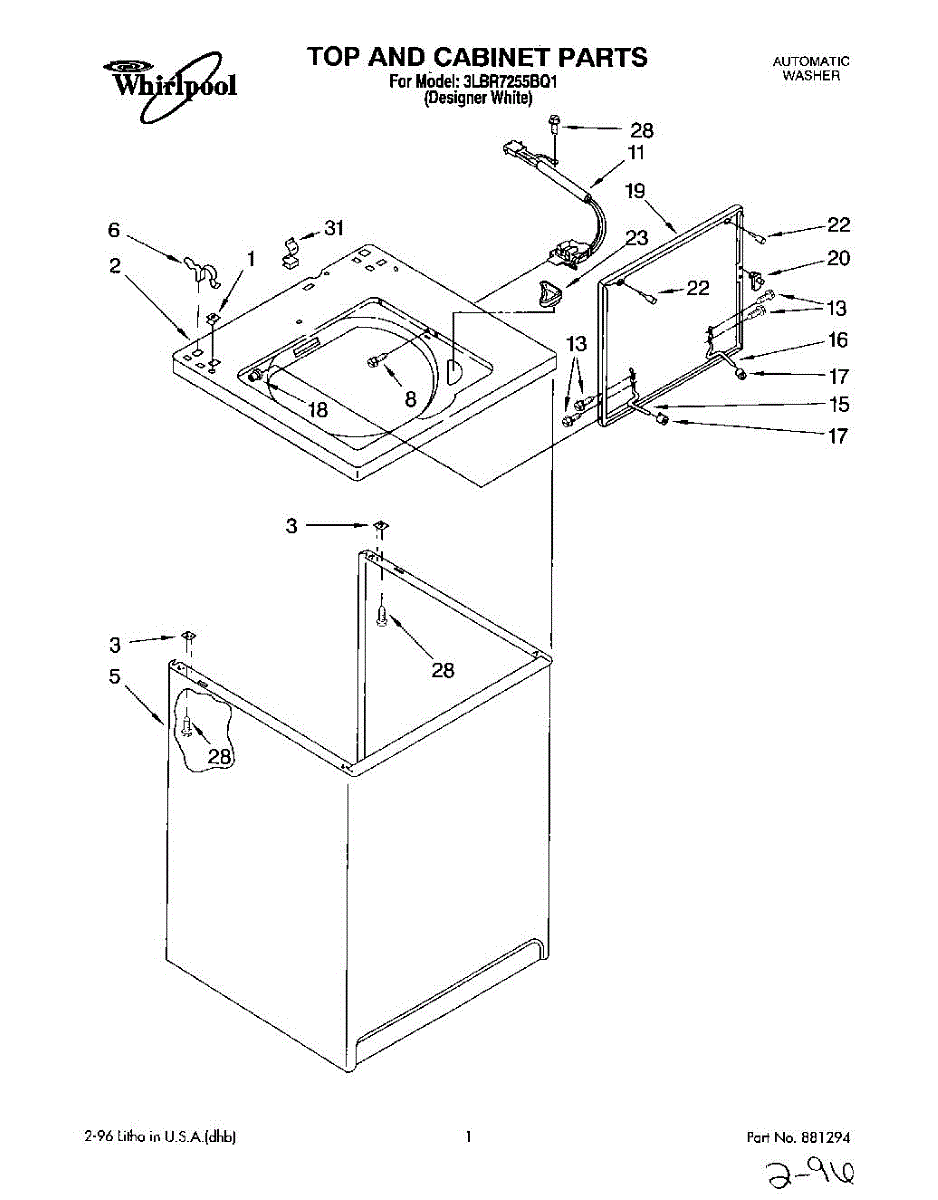 Repair manual for top loading automatic direct drive washing machines made by Whirlpool. Covered brands include Whirlpool, Sears, Kenmore, Kitchen Aid, Roper, and Estate. Easy to follow photographs and step-by-step repair procedures.