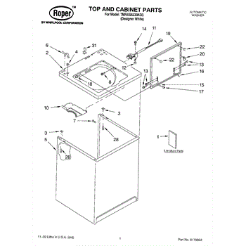The Washer Lid Screw is an OEM part for Whirlpool washing machines. This 6-32 x .340 screw secures the washer lid to the hinge assembly, ensuring the lid opens and closes smoothly and stays securely in place during operation.