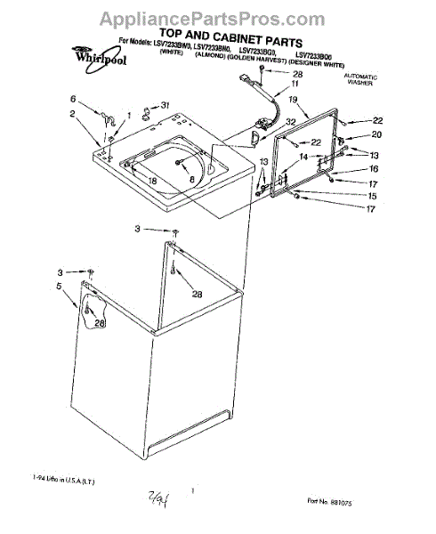 Parts for Whirlpool LSV7233BQ0: 01 - Top And Cabinet, Lit / Optional Parts