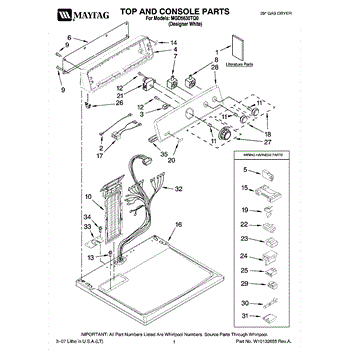 The Console Clip is an OEM part compatible with Whirlpool dryers. This clip secures the control console assembly to the top panel, ensuring it is firmly mounted during operation. Properly functioning clips are necessary to maintain the correct alignment of controls and prevent detachment.