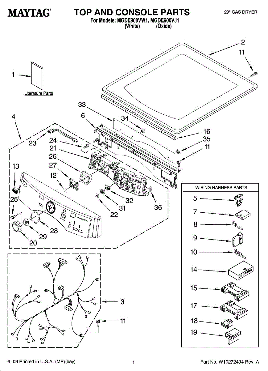 Wire harness for dryers. Connects electrical components inside the dryer cabinet. Replace if wires are frayed, damaged, or connections are loose or burnt.