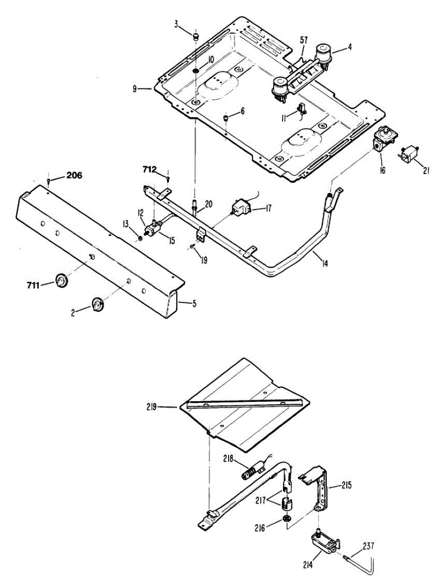 This surface burner spark electrode creates the electric arc that lights the gas at the burner. Replacing a worn electrode restores consistent, reliable ignition.
