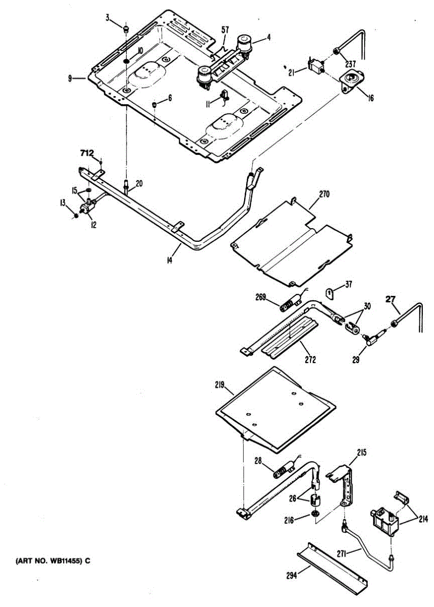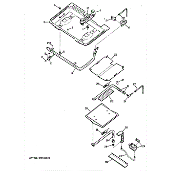 This surface burner spark electrode creates the electric arc that lights the gas at the burner. Replacing a worn electrode restores consistent, reliable ignition.