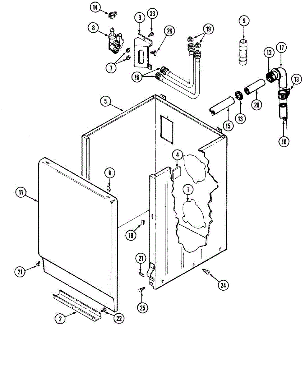 Prevents backflow of drain water into fresh water supply. Mounts on top of washer. Replace if cracked, leaking, or damaged to restore proper drainage.
