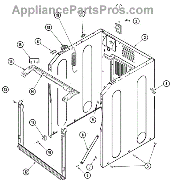 This cabinet spring secures the appliance cabinet to the frame to control movement and vibration. Replacing a fatigued or broken spring restores cabinet stability and helps reduce rattling and excessive shaking during operation.