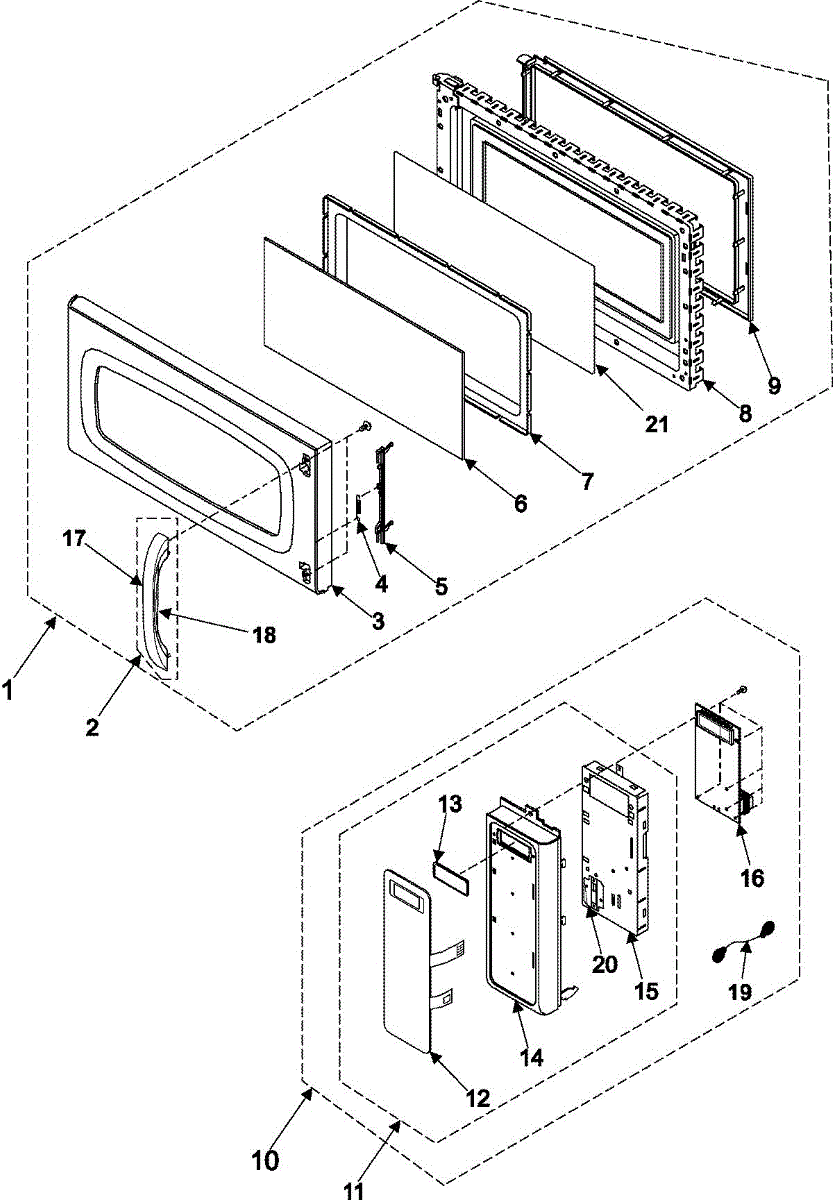 Complete door assembly for microwaves. Replaces cracked, broken, or damaged doors. Includes handle, window, and hinges for full door replacement.