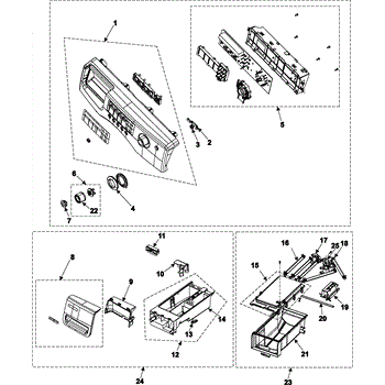 This assembly is the housing the dispenser drawer slides into, restoring a smooth pull-out action and proper dispensing. It supports the drawer and channels water through the detergent, bleach, and fabric softener compartments into the tub.