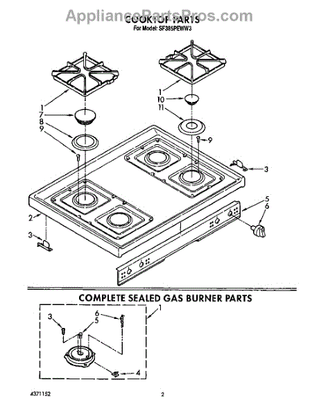 Parts for Whirlpool SF385PEWN3: 02 - Cooktop, Complete Sealed Gas Burner Parts