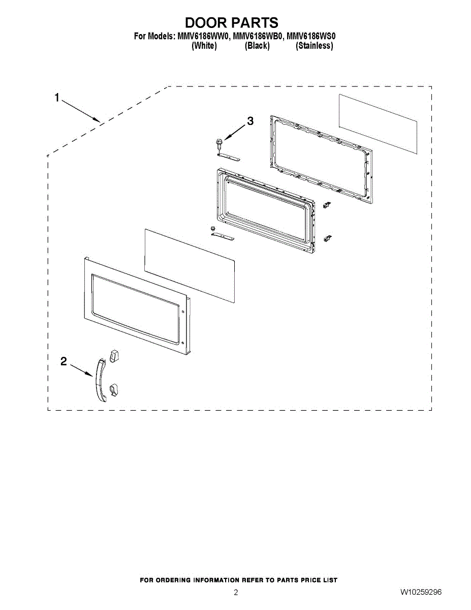 White plastic handle that attaches to the microwave door exterior. Replace if cracked, broken, or missing. Installs with screws behind inner door trim.