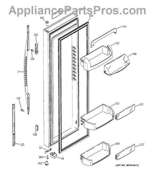 The Door Bin is an OEM part for GE refrigerators. It is a convenient storage compartment located on the interior of the refrigerator door, designed to hold and organize smaller items such as condiments, jars, or beverages.