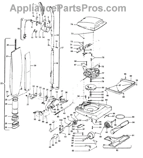 Parts for Hoover U4141001: 02 - Handle, Mainbody, Baghousing, Hood Parts