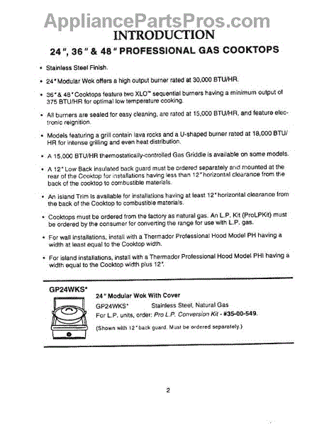 Parts for Thermador GP24WKS: 02 - Introduction Parts