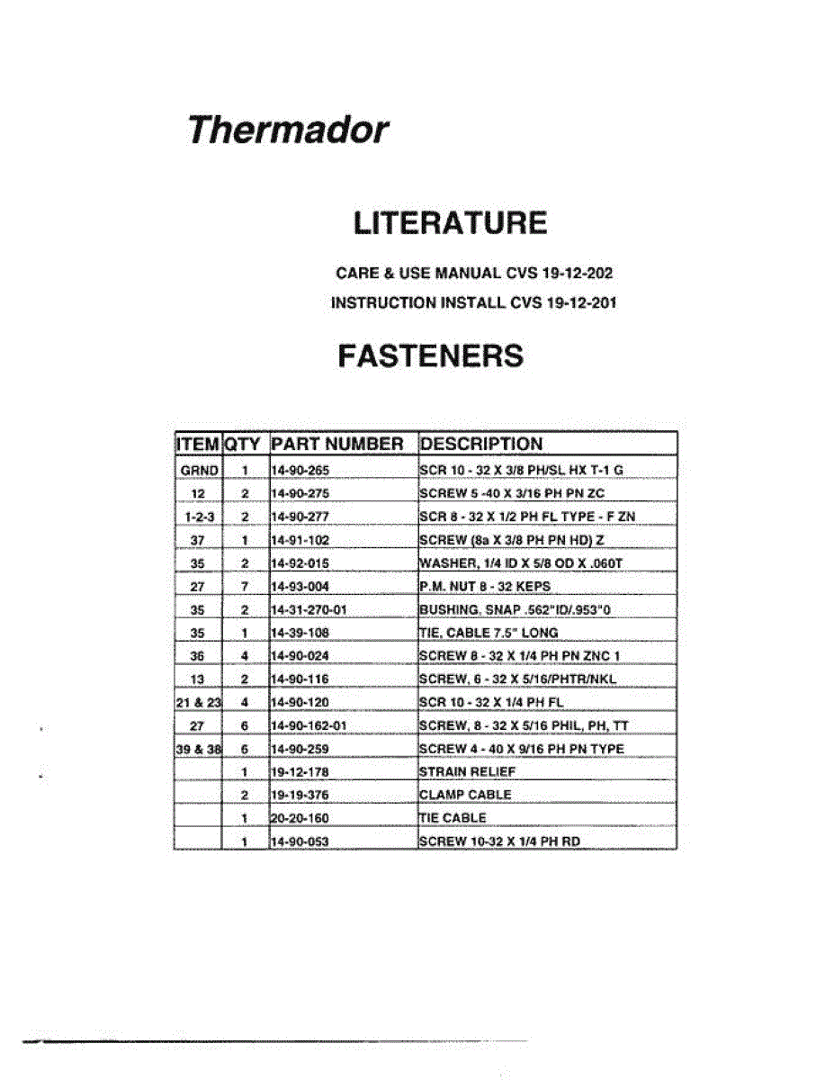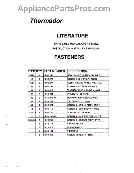 Parts for Thermador CVS45RB: 02 - Literature & Fasteners Parts